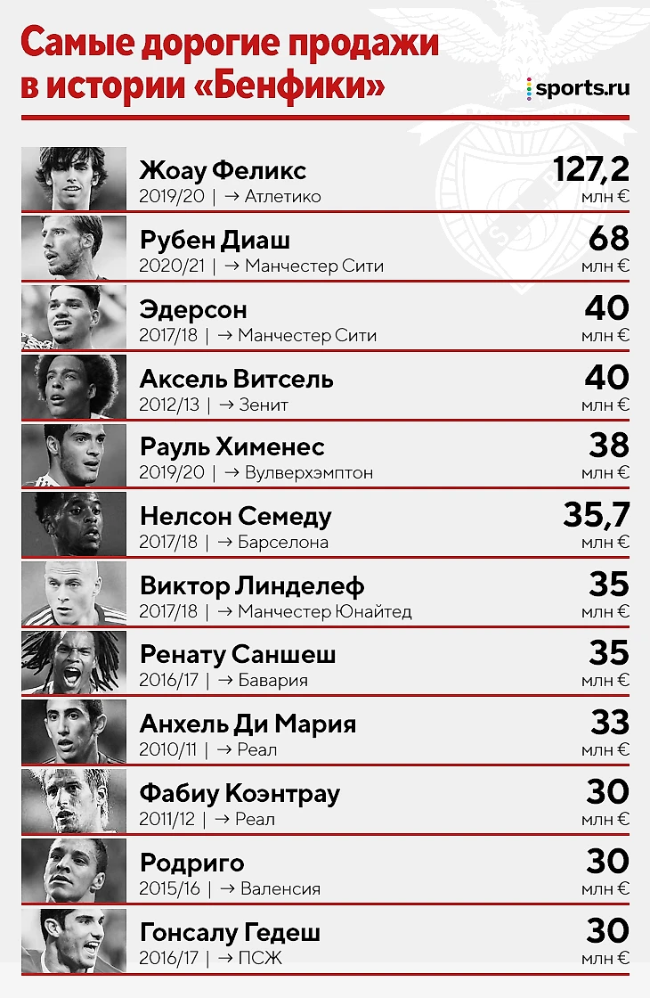 • У клуба есть примеры дорогих и относительно недавних продаж. Жоау Феликса отпустили за 127 миллионов евро, Рубена Диаша отдали за 68 миллионов, Эдерсон ушел за 40 миллионов.