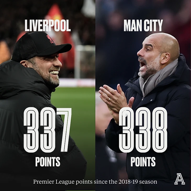 С начала сезона 2018/19 «Ливерпуль» набрал 337 очков из максимальных 432, в то время как у «Манчестер Сити» 338 очков.