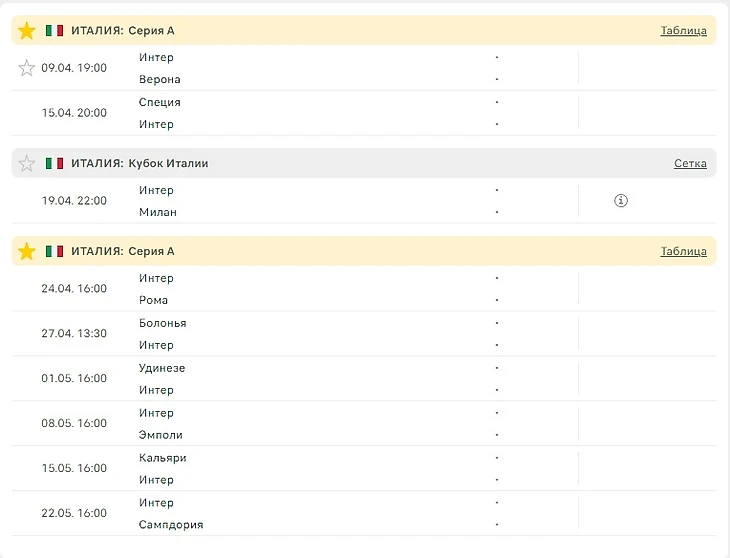 Значит так, мы имеем три команды: Интер (9-10 матчей), Милан (8-9) и Наполи (7). У Интера и Милана матчи в кубке впереди, поэтому неопределенное количество матче осталось до конца чемпионата.Ниже представлены все матчи до конца чемпионата.