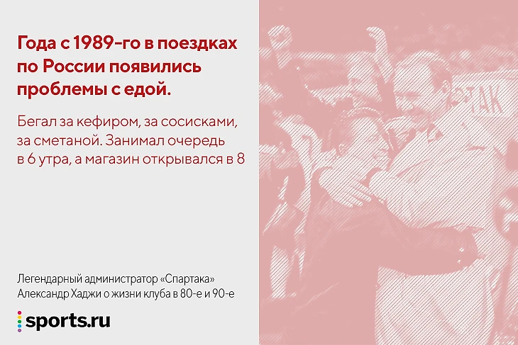 О жизни команды без владельца с безлимитными счетами лучше всех помнит легендарный администратор «Спартака» Александр Хаджи, который работал в клубе больше 25 лет. В 80-е и 90-е он испытал всякое: например, занимал с утра очередь, чтобы урвать команде сметану на завтрак.
