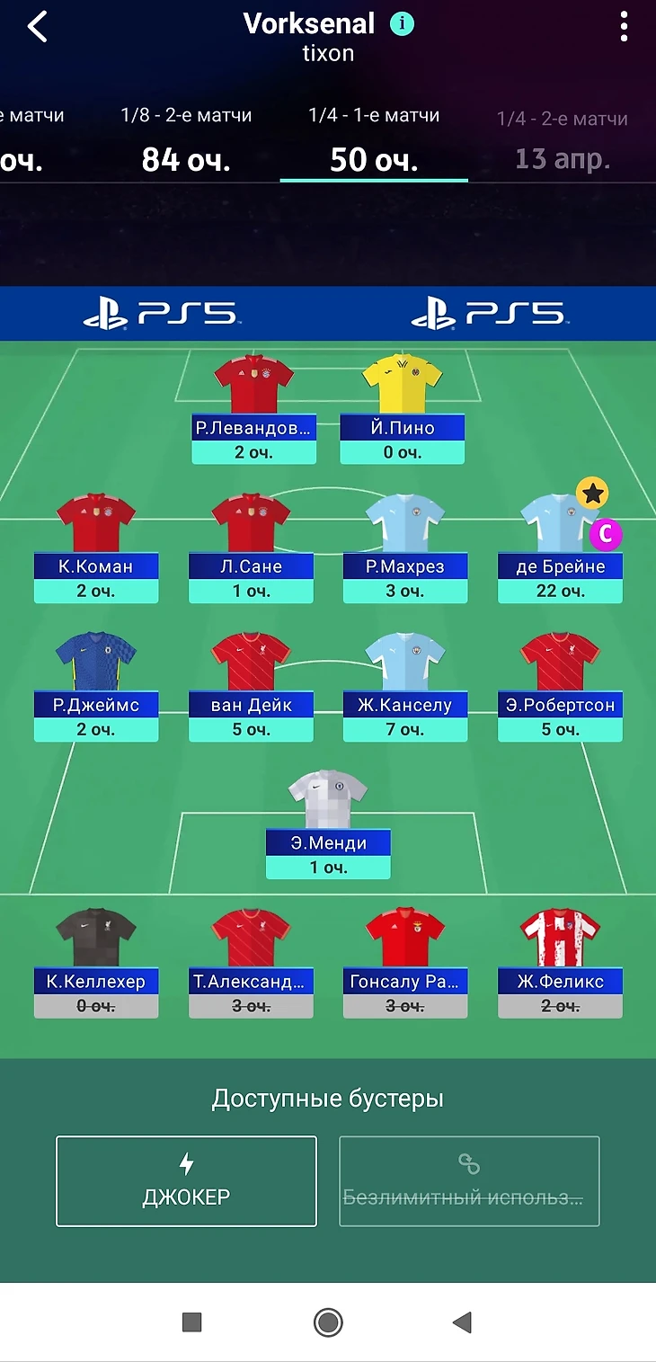 Ставка на КДБ спасла мой тур, в последнее время Кевин находится в отличной форме (забил гол в прошлом матче АПЛ Бернли), в этом матче он смог добыть звание лучшего игрока, клиншит и забитый гол, вкупе это 11 очков, что очень неплохо, на этой стадии ЛЧ.