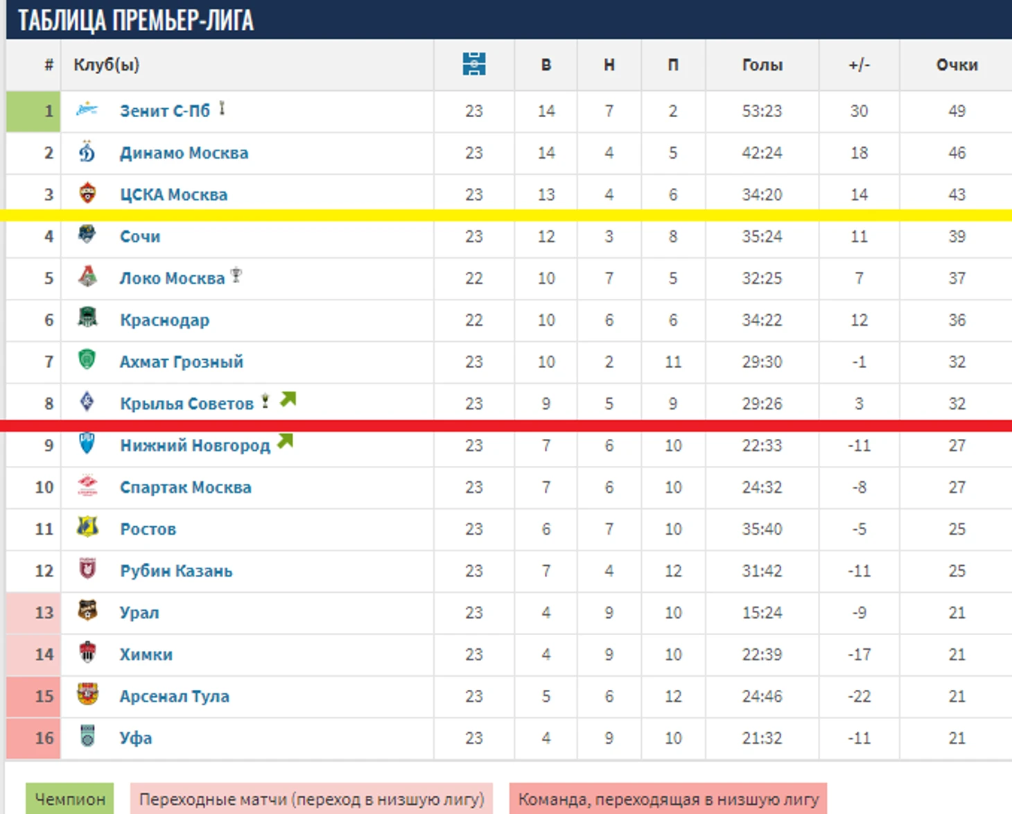 В таблице выше две черты. Красная - все, кто ниже, уже не станут чемпионом математически. Жёлтая - фактически. Обычно лидер набирает по два очка за матч, значит любой желающий одержать семь побед сможет сократить отставание очков на семь. То есть, в гонке остаются лишь ЦСКА и "Динамо", которые ко всему прочему имеют "хуже" по личкам против питерцев. Судя по тому, как ставят пенальти на Смолове в Краснодаре, для кого-то первое чемпионство бело-голубых с 1976 года будет выглядеть максимально красиво.