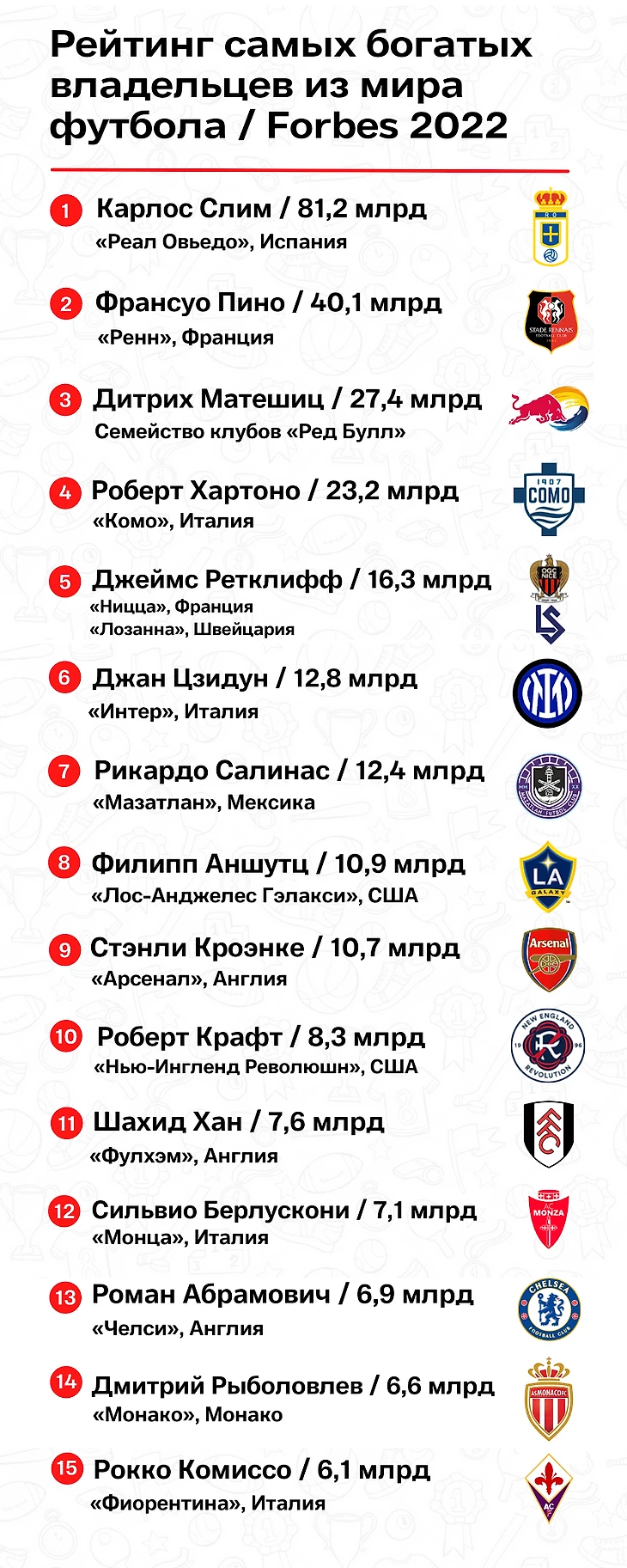 Хочется подчеркнуть: из-за отсутствия в рейтинге от Forbes в списке вы не увидите таких имён, как Шейх Мансур («Манчестер Сити» и другие представители City Football Group), Нассер Аль-Хеллаифи («ПСЖ»), Андре Аньелли («Ювентус»).