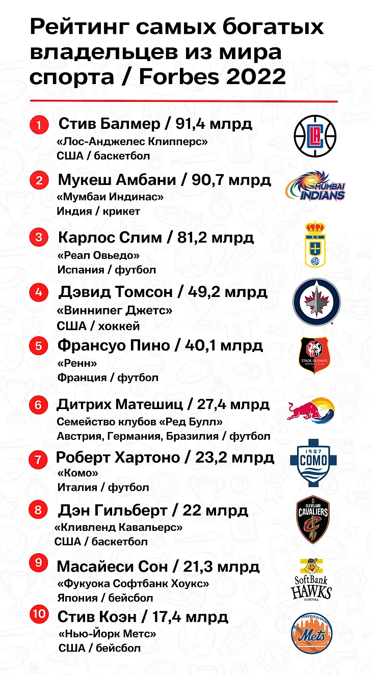 Если же говорить об общей рейтинге самых богатых владельцев из мира спорта, то лидером с показателем в 91,4 млрд остаётся Стив Балмер. В первой десятке находятся владельцы четырёх футбольных («Ред Булл» как единая группа - прим.), двух баскетбольных, двух бейсбольных, одного хоккейного клуба, а также «Мумбаи Индианс» из индийской премьер-лиги по крикету. Причём владелец этого клуба, известный Бизнесмен Мукеш Амбани (10-е место в общем рейтинге) с состоянием в 90,7 млрд долларов практически не уступает экс-директору Microsoft Балмеру.