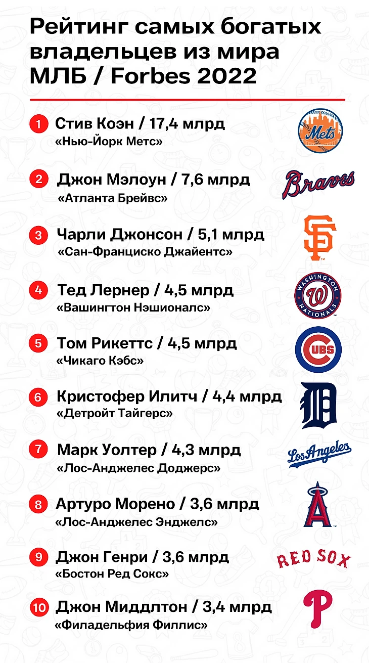 В списке из четырёх североамериканских спортивных лиг МЛБ по состоянию владельцев занимает последнее место. Например, самым богатым является Стив Коэн («Нью-Йорк Метс»), который на 2022 год обладает состоянием в 17,4 млрд долларов (96-е место в общем рейтинге). Следом идёт с показателем в 7,6 млрд Джон Мэлоун – владелец действующего чемпиона лиги «Атланта Брейвс» (321-е место).