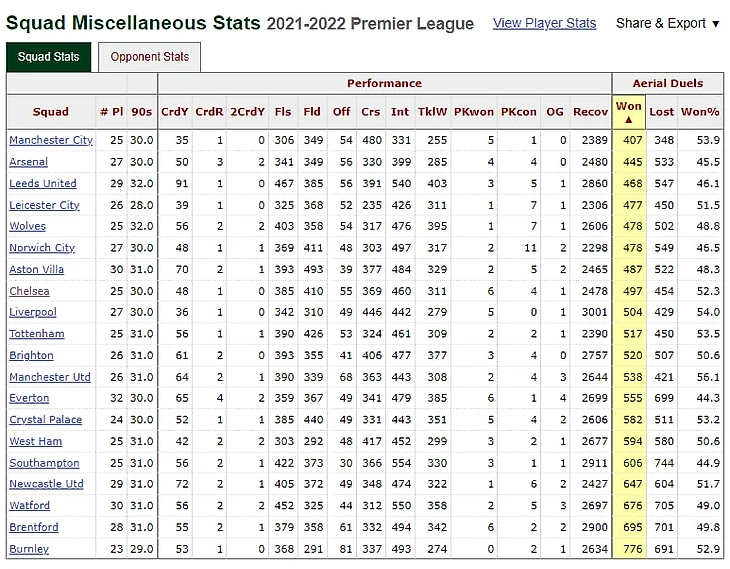 Сити на 3ем месте по % выигранных верховых единоборств.