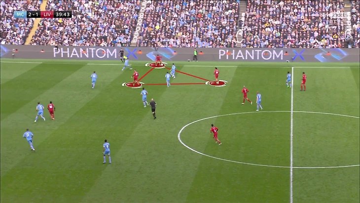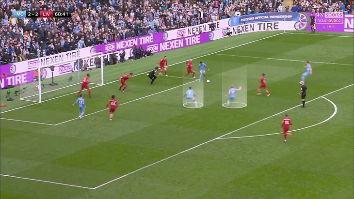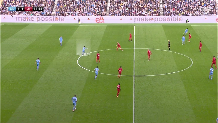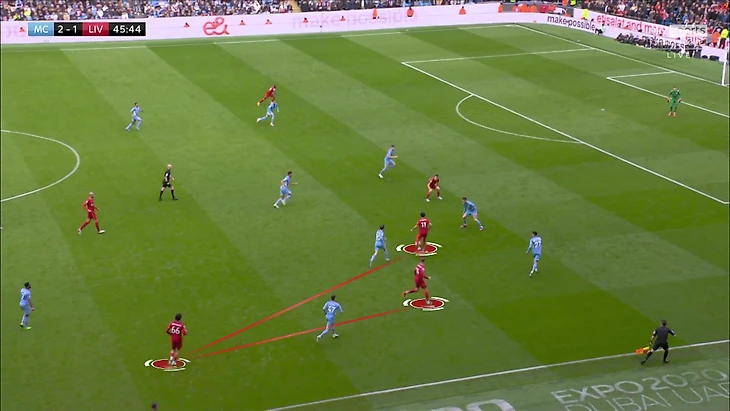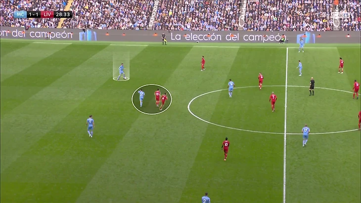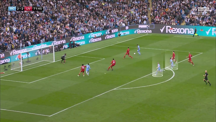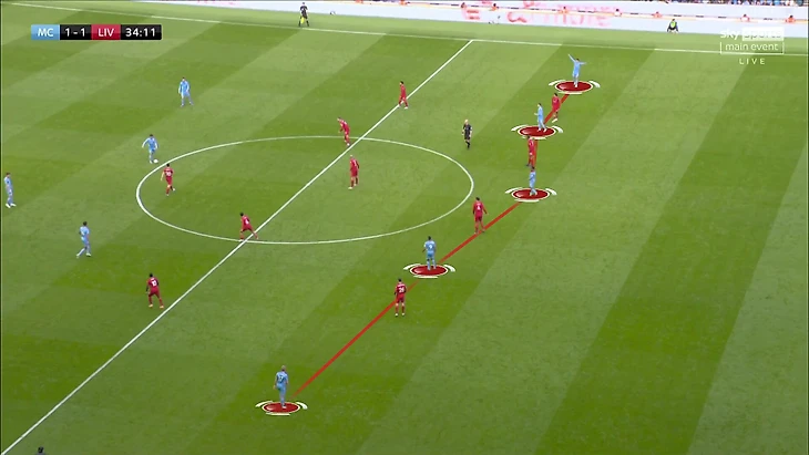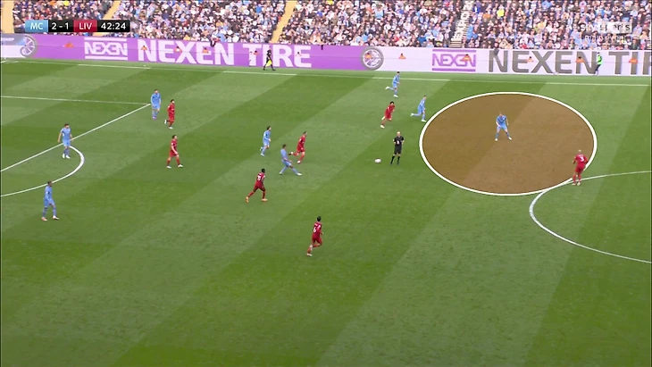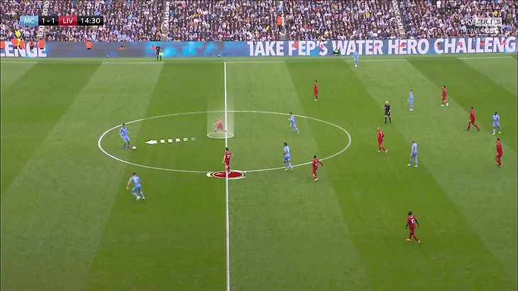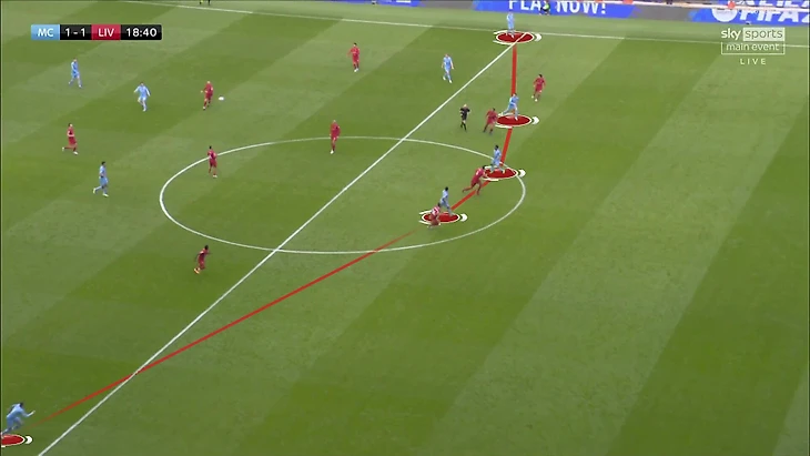 Такая смена ролей отлично привела к более прямолинейному футболу – без вскрытия чужой опорной в позиционных атаках. Зато категорически эффективно вскрывала высокую линию «Ливерпуля» – большинство соперников боятся играть против «Сити» таким образом. Гвардиола предполагал, что «Ливерпуль» не испугается – и преобразовал игру так, чтобы вскрывать их иным образом.