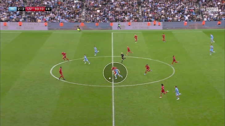8. Второй важнейший источник угрозы (он продержался весь матч) – КДБ в быстрых атаках. Открывания сразу после потери, способность тащить мяч без снижения ритма и качество разрезающих передач – он умеет все и наказывал по-разному.