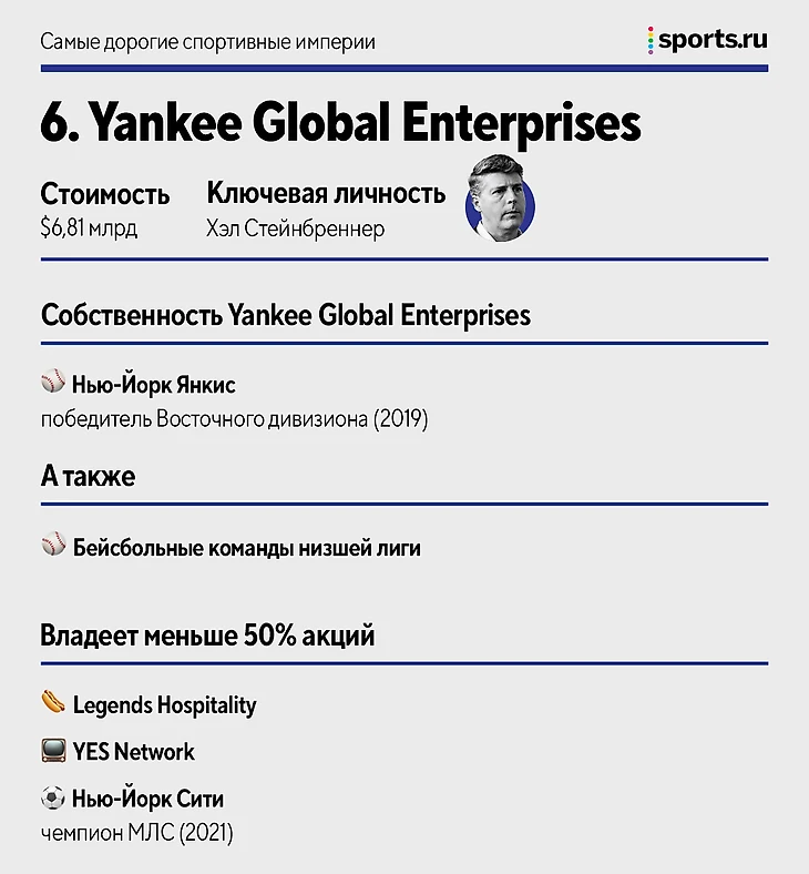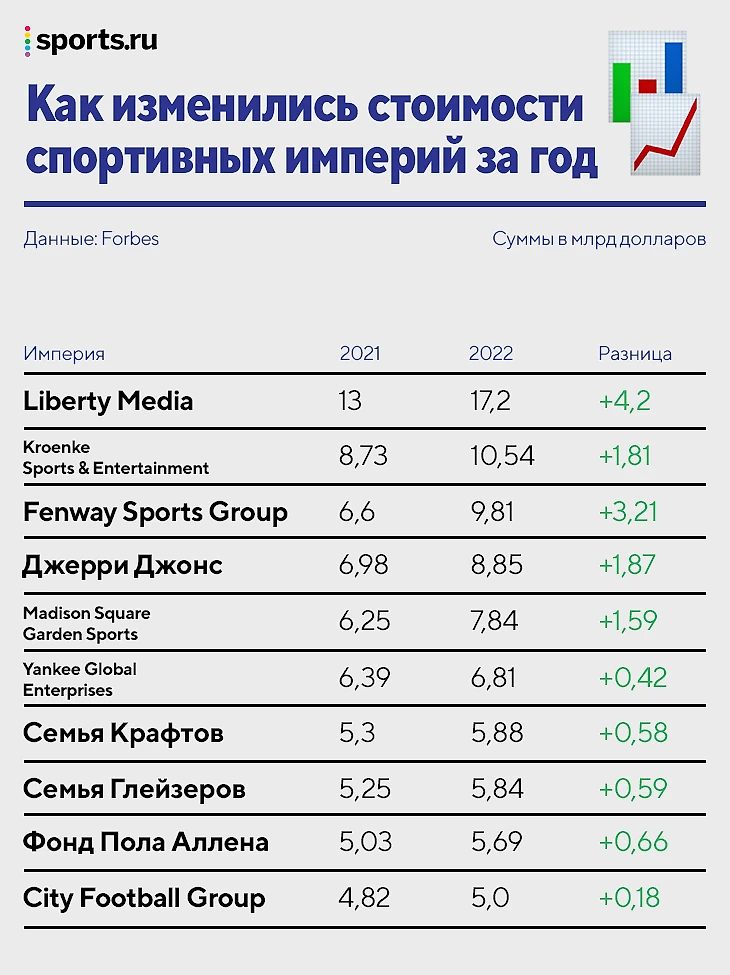 Во многом такие сдвиги обусловлены тем, что Fenway Sports Group и Square Garden Sports подорожали заметно сильнее конкурентов по позициям. При этом ни одна из империй не потеряла в цене – в постковидный год все продолжили расти, хоть и с разным темпом. А суммарно топ-20 империй подорожал на 22% – со 102 до 124 млрд долларов.
