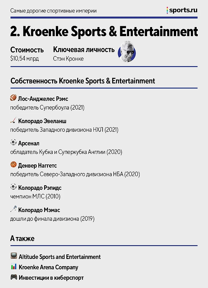 На графиках выделены ключевые активы каждой империи и их последние спортивные успехи, другие проекты (включая инвестиции в киберспорт).