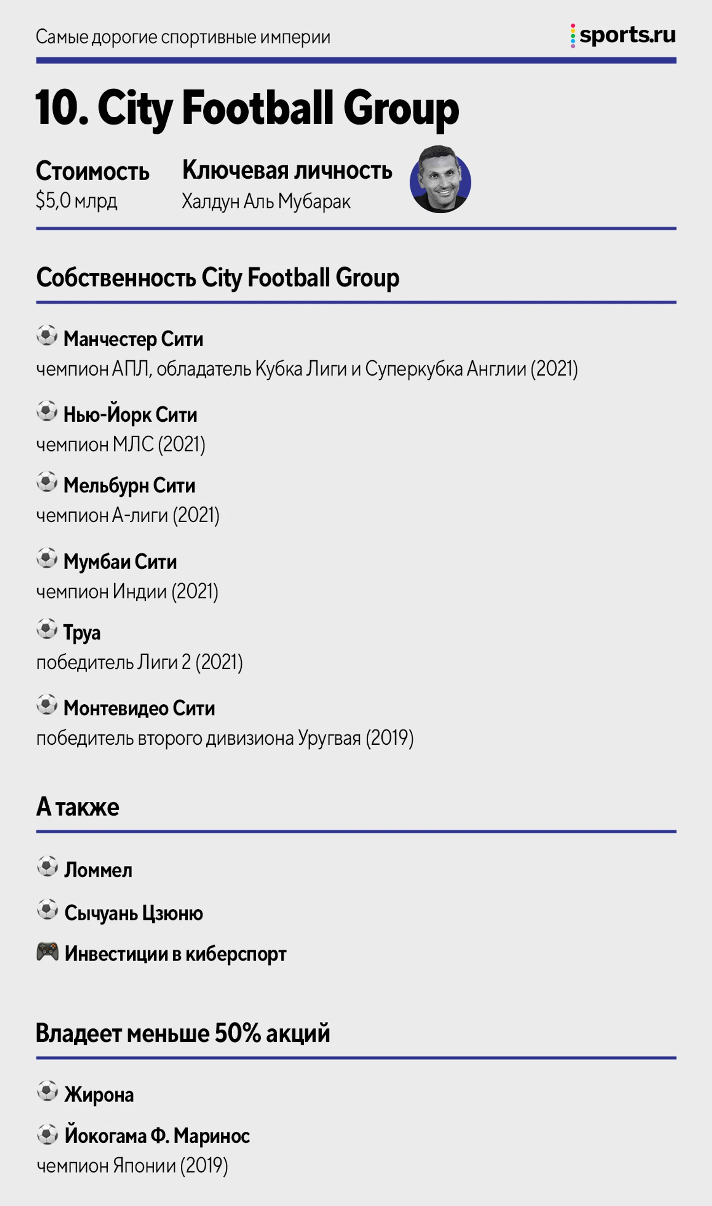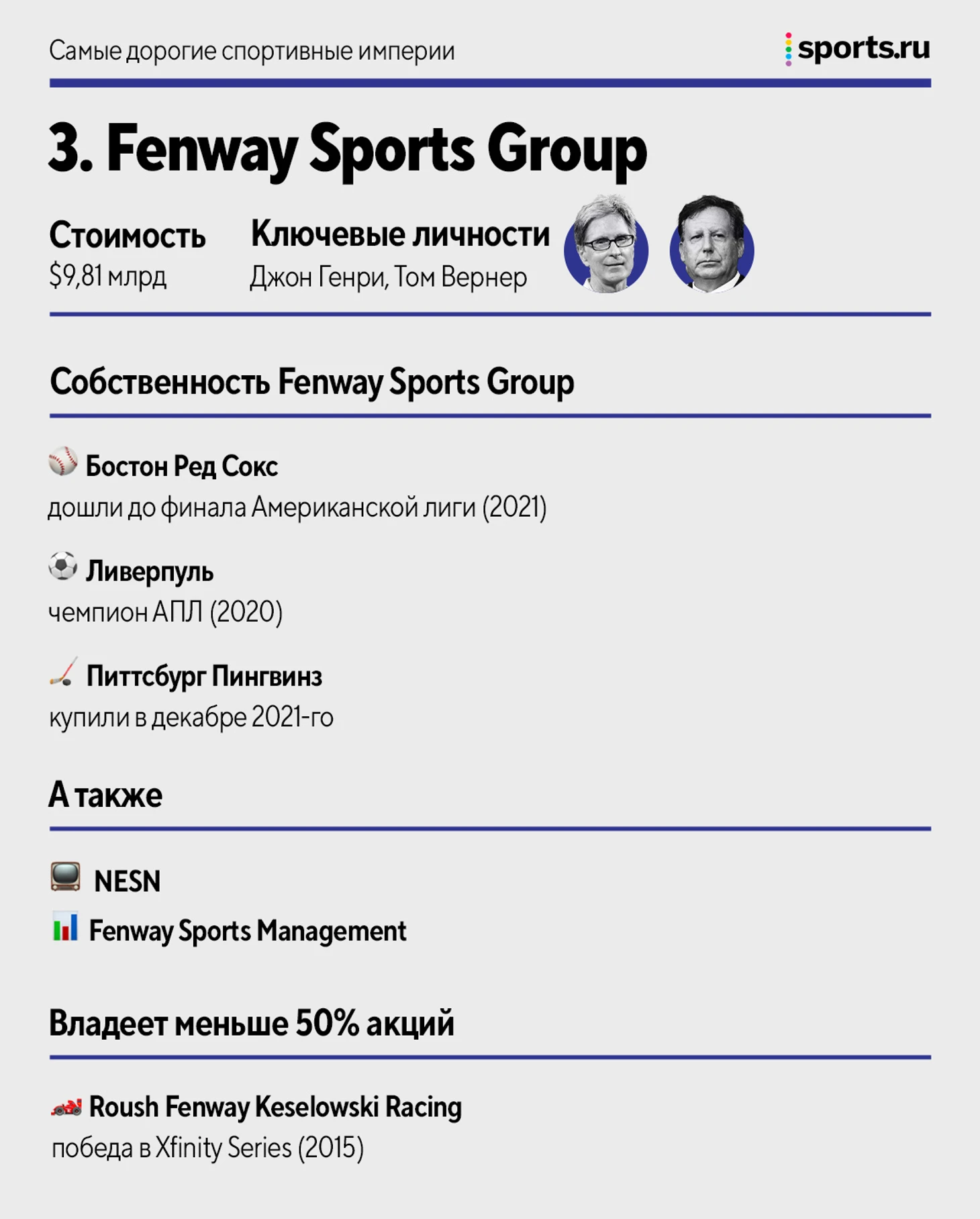 Большинство из топ-25 владеет одной или двумя командами, но растет тренд на мультивладение – только посмотрите на список City Football Group. В декабре Fenway Sports Group купила «Питтсбург Пингвинз» за 900 млн долларов – таких корпораций будет только больше.