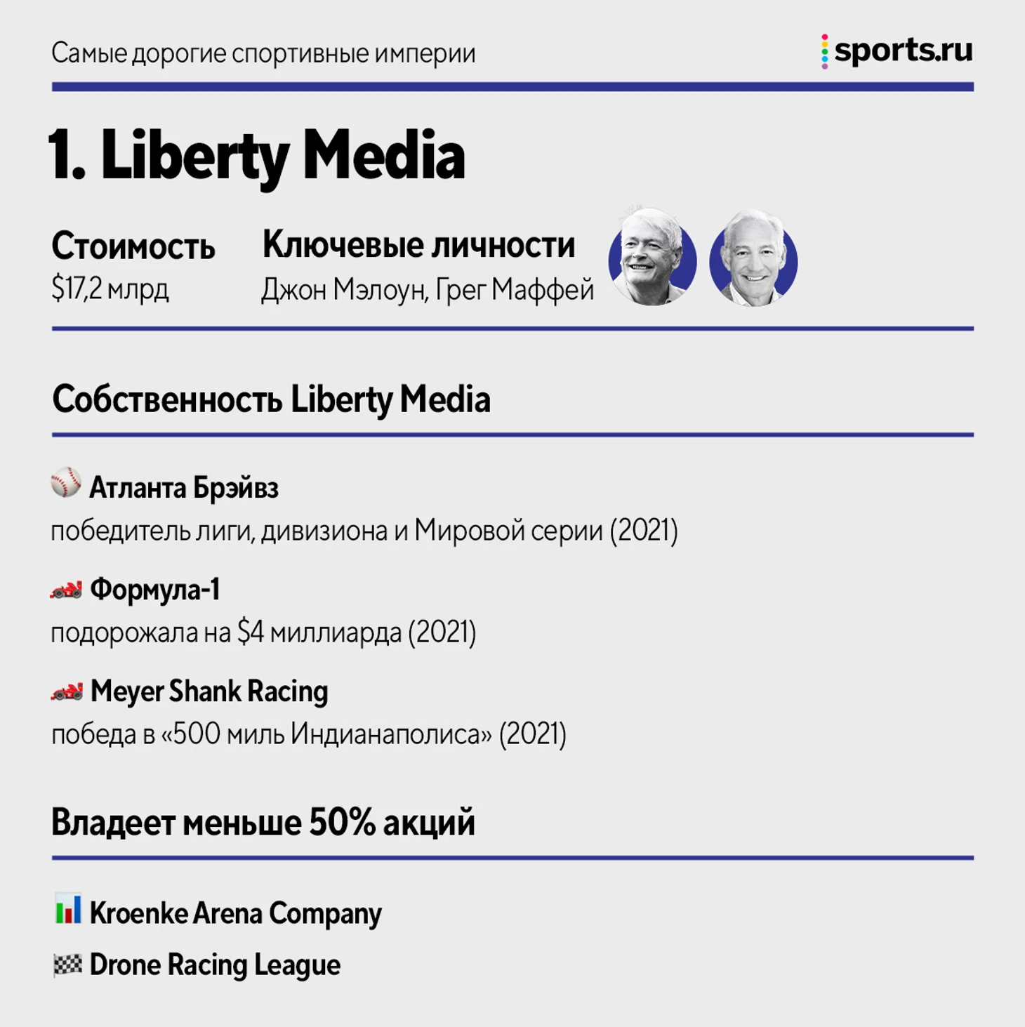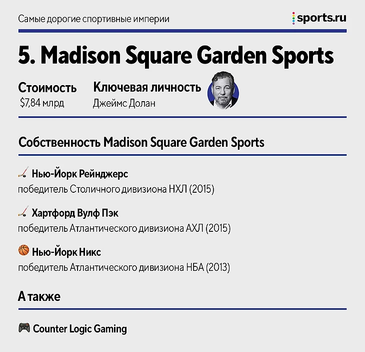 • Liberty Media за год подорожала на 4,2 миллиарда – не удивляет, учитывая успехи активов. В целом состав топ-10 не изменился. Обновились лишь позиции – Fenway Sports Group поднялся на третью строчку, подвинув Джерри Джонса. Madison Square Garden Sports (поднялись с шестой строчки на пятую) и Yankee Global Enterprises тоже поменялись местами.
