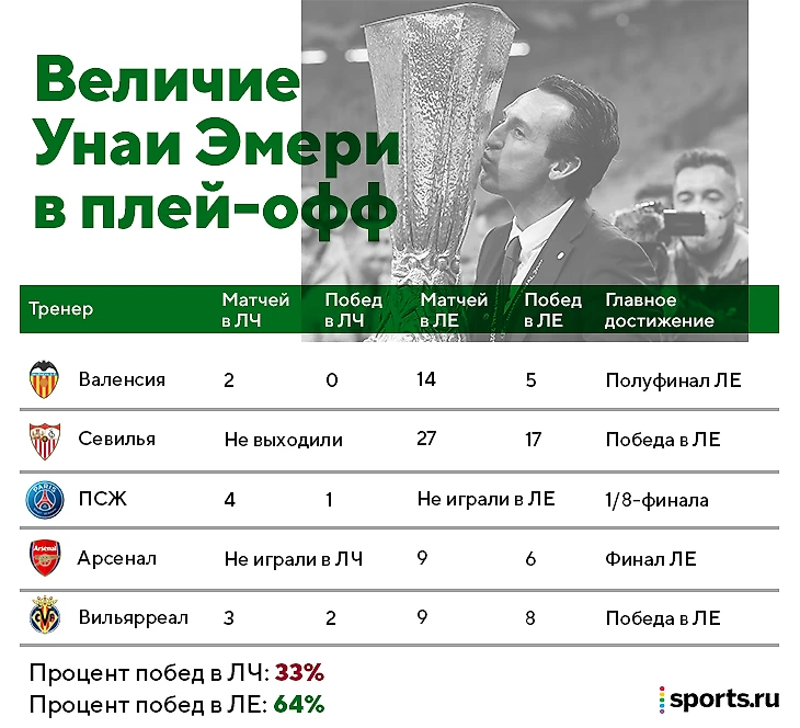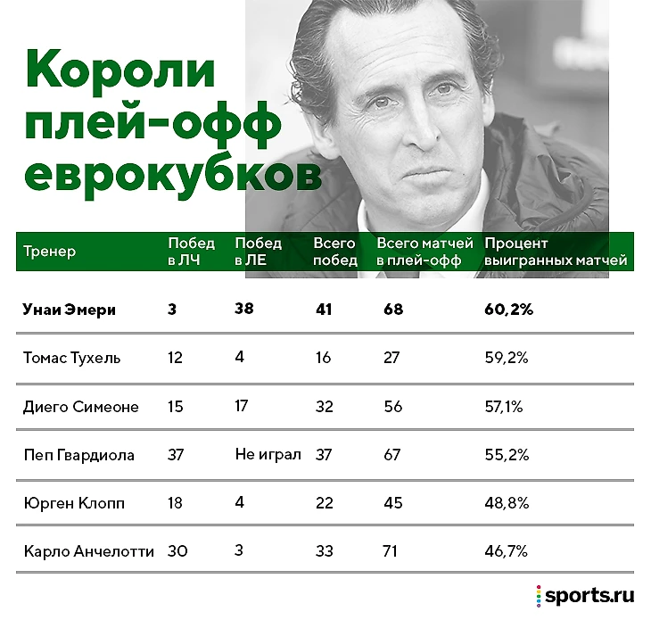 • Эмери выиграл большинство встреч в Лиге Европы, но и отыграл прилично – рисков было намного больше. Прямо рядом с Унаи Пеп – при этом он никогда не играл в ЛЕ и все его победы исключительно в плей-офф ЛЧ.