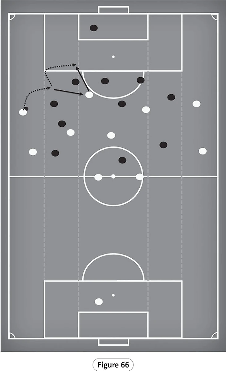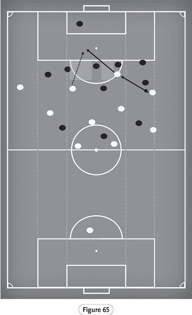 На рисунке 65 мы видим еще один пример того, как Мане начинает атаку из более глубокой позиции и использует ее, чтобы вырваться за пределы оборонительной линии противника.