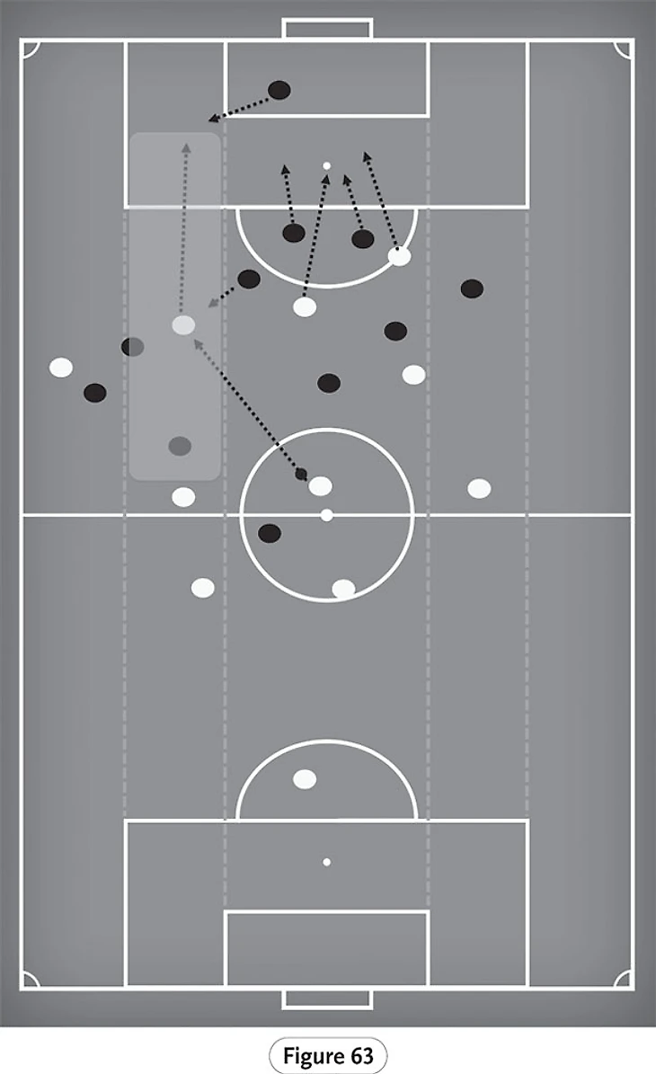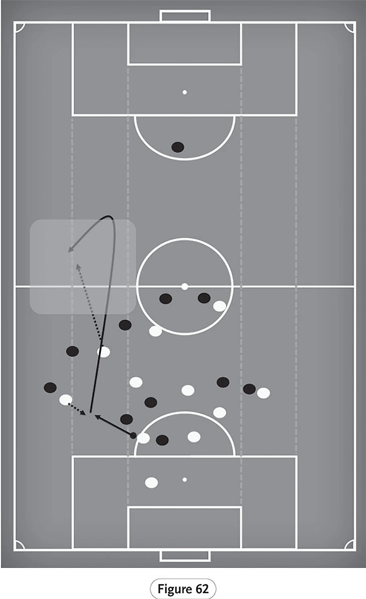 Его скорость и способность вести мяч мимо игроков соперника являются отличным механизмом высвобождения, который позволяет «Ливерпулю» быстро переходить от оборонительной фазы к атакующей. Когда «Ливерпуль» обороняется, они, как правило, оставляют Салаха и Фирмино в более продвинутых зонах, в то время как левая сторона поля, как правило, открыта. Пример таких переходов мы видим на рисунке 62, когда «Ливерпуль» отыгрывает мяч в глубине своей половины поля.