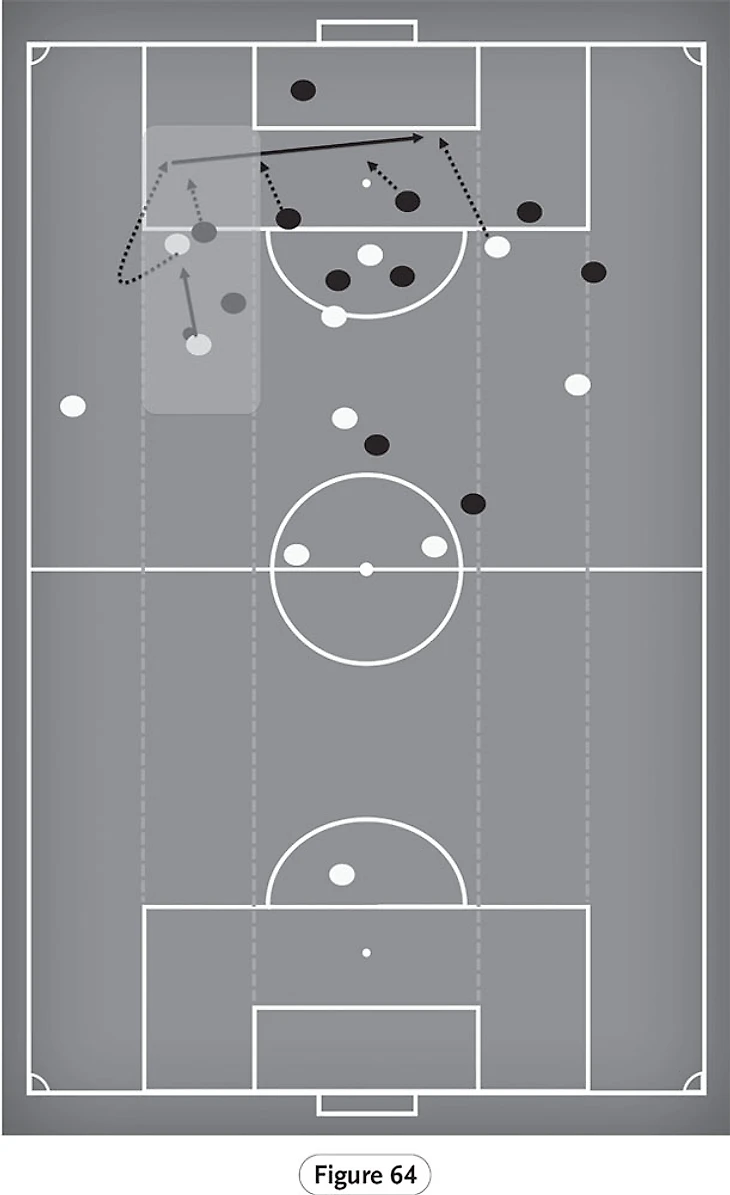 Мы видим пример такого рода действий в действии на рисунке 63, где Мане расположен в левом полупространстве на заметно более глубокой линии, чем Салах и Фирмино. Когда мяч начинает идти от защиты, Мане может принять владение с помощью простого диагонального паса, который открывает доступ к пространству. Как всегда, первая мысль, которая приходит Мане, когда он получает мяч в этих областях — это развернуться и держать курс на линию обороны. По мере того, как он продвигается выше по полю, защитник пытается вступить с ним единоборство, но поскольку Мане начал свой забег глубже, он уже набирает скорость и может просто обойти подкат. Даже сейчас, когда он на полной скорости входит в штрафную и когда вратарь выходит, чтобы побороться за мяч, Мане демонстрирует свою самоотверженную сторону, отбрасывая мяч в центр поля, занятый другими нападающими, вместо того, чтобы пытаться самостоятельно пробить с острого угла.