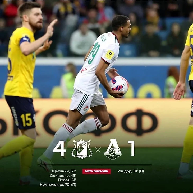 На 49-й минуте Изидор спиной обработал передачу Дмитрия Баринова, но не использовал шанс сократить отставание в счете.И уже 12 минут спустя пришел третий гол в ворота Локо. Хавбек ростовчан Байрамян передачей на Дмитрия Полоза в стиле Луки Модрича обрезал всю команду красно-зеленых, и нападающий "Ростова" отправил мяч в сетку – 3:0 в пользу хозяев. Всего через 6 минут в ворота железнодорожников был назначен пенальти за игру рукой Дмитрия Живоглядова, и на 70-й минуте благодаря реализованному Николаем Комличенко одиннадцатиметровому счет стал максимально неприличным – 4:0. К тому же, на 74-й был отмененный из-за офсайда гол того же Комличенко. Сказать, что команда поплыла, как мороженное при +40, – не сказать ничего.