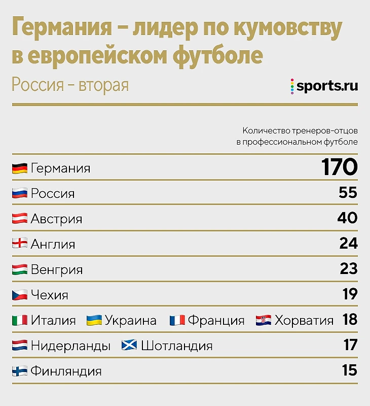 Россия – в топ-3, но тут другая история: все 55 случаев на высшем уровне (РПЛ или чемпионат СССР, ФНЛ и ФНЛ-2, молодежное первенство). Логично предположить, что такого кумовства в верхушках футбольных пирамид нет нигде в Европе.