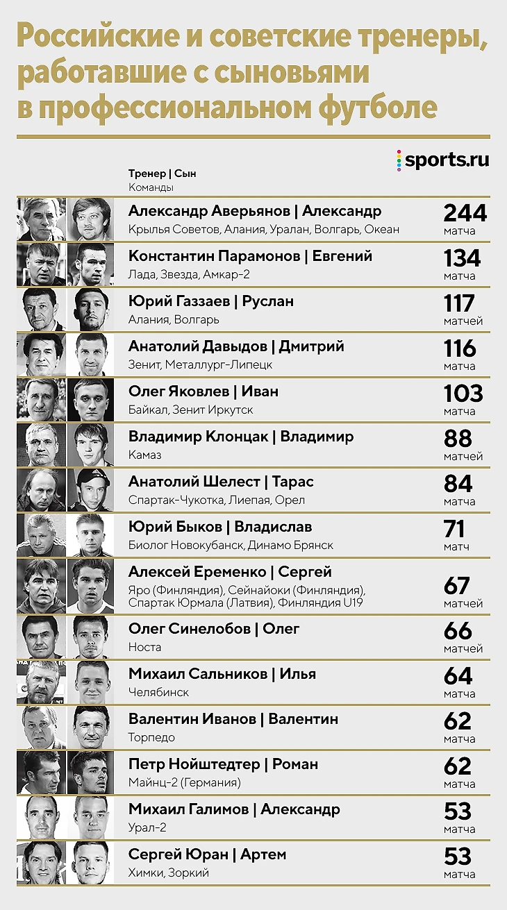 Так делал Валерий Петраков (сын Юрий играл в его брянском «Динамо» Брянск, «Томи» и «Торпедо»), Александр Новиков ввел в основу «Динамо» сына Кирилла (в чемпионате России-2000), Софербий Ешугов продюсировал карьеру сына Мурата в нальчикском «Спартаке» и брянском «Динамо», Андрей Тихонов выпускал сына Михаила в «Енисее» и «Крыльях Советов», а Роман Пилипчук дал игровое время сыну Ивану в чемпионате Латвии (юрмальский «Спартак»).