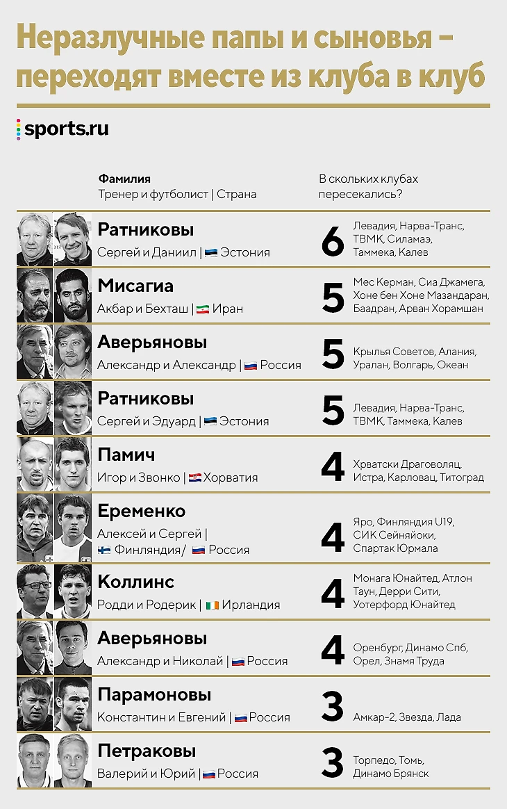 Но так бывает не всегда. В 33 случаях профессиональные тренеры использовали сыновей в трех и более клубах, 4+ клуба у восьми пар (три связаны с Россией, две – с Эстонией).