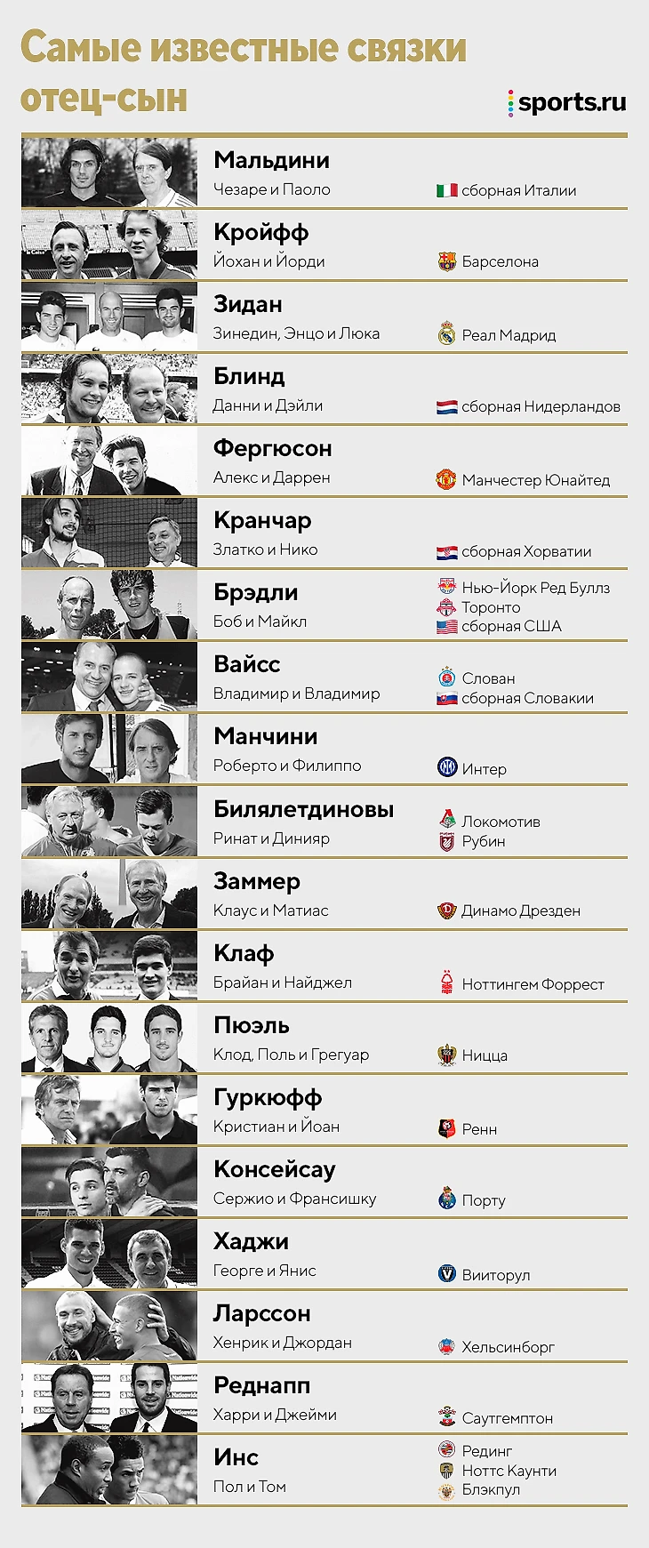 Вообще кумовство в футболе гораздо шире, чем работа тренера-отца и футболиста-сына в одном клубе. Нередко в одной команде выступает несколько братьев (Березуцкие, Невиллы или Де Буры), дядя может тренировать племянника (как у Лэмпарда и Рэднаппа в «Вест Хэме»), а еще кто-то из родственников футболиста работать в руководстве или администрации клуба. Но составить масштабную выборку из таких средних и дальних родственных связей в мировом футболе почти невозможно. А вот отследить сотрудничество сына-футболиста и отца-тренера – вполне.