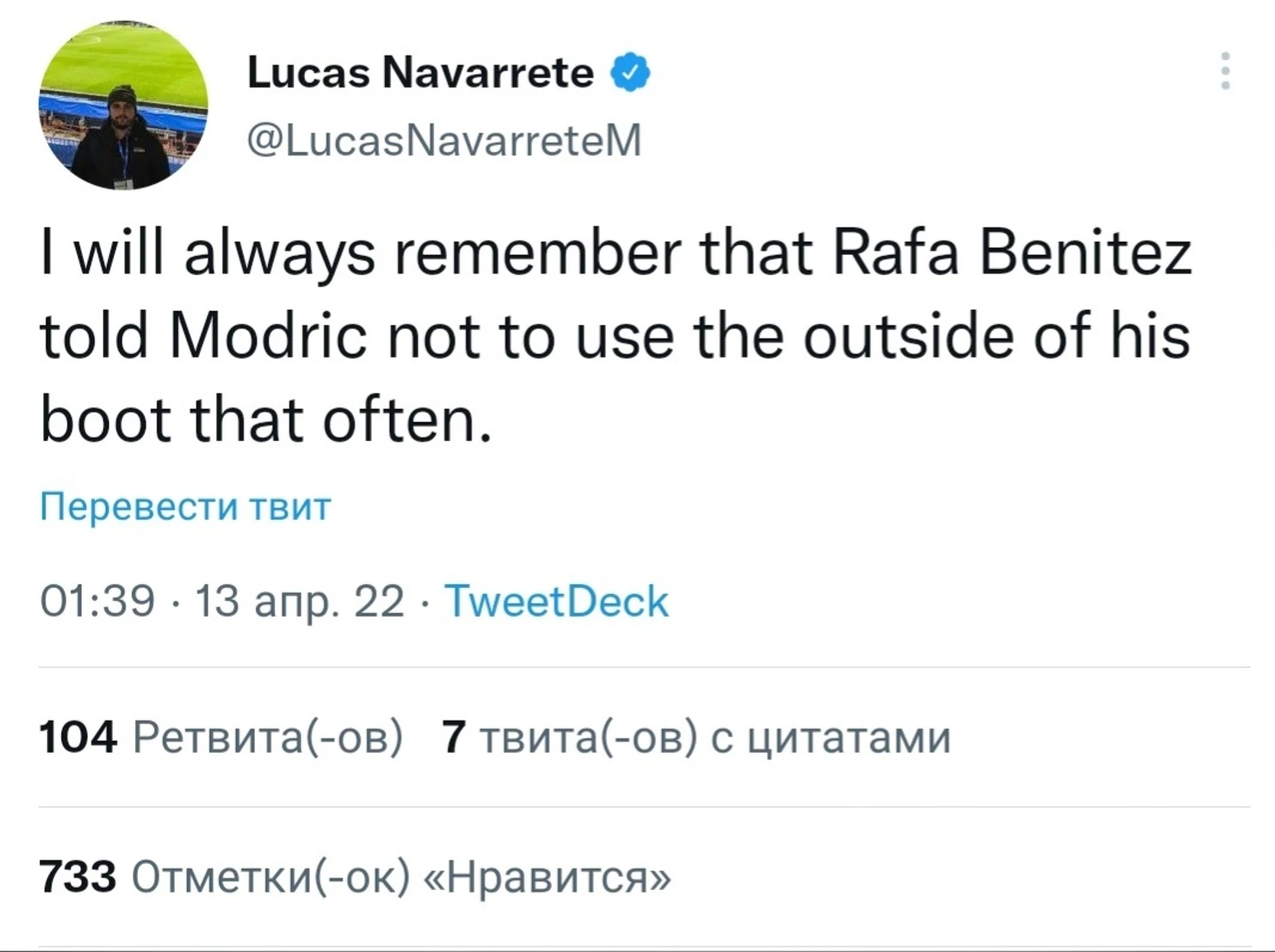«Никогда не забуду, как Рафа Бенитес запрещал Луке Модричу так часто пасовать внешней стороной стопы».