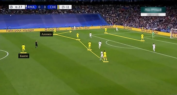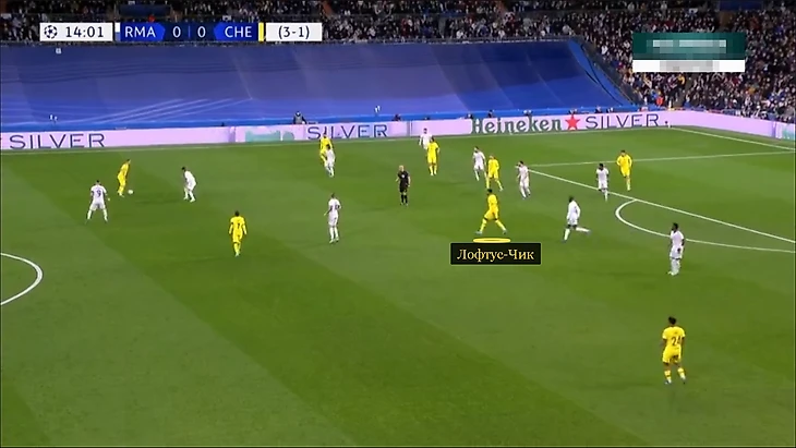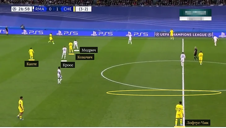 Лофтус-Чику помогали низкие стартовые позиции Канте и Матео Ковачича. Француз и хорват открывались в опорной зоне «Челси» и выманивали хавбеков «Реала», что вскрывало пространство для смещений Рубена к центру. Далее британец приковывал сковывал других оппонентов – например, Каземиро или одного из центральных защитников – и открывал зоны для партнеров. Структура «Мадрида» страдала.