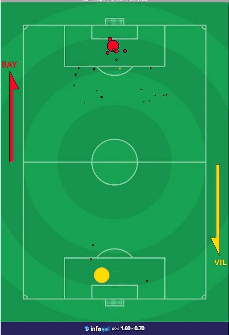 За несколько минут до конца тайма один на один с Нойером выскочил герой первой игры Данджума, Ману спас, но и офсайд арбитры так же зафиксировали. Под самый свисток на перерыв Морено бил в ближний угол ворот «Баварии», промах, но концовка однозначно осталась за «желтой подлодкой».