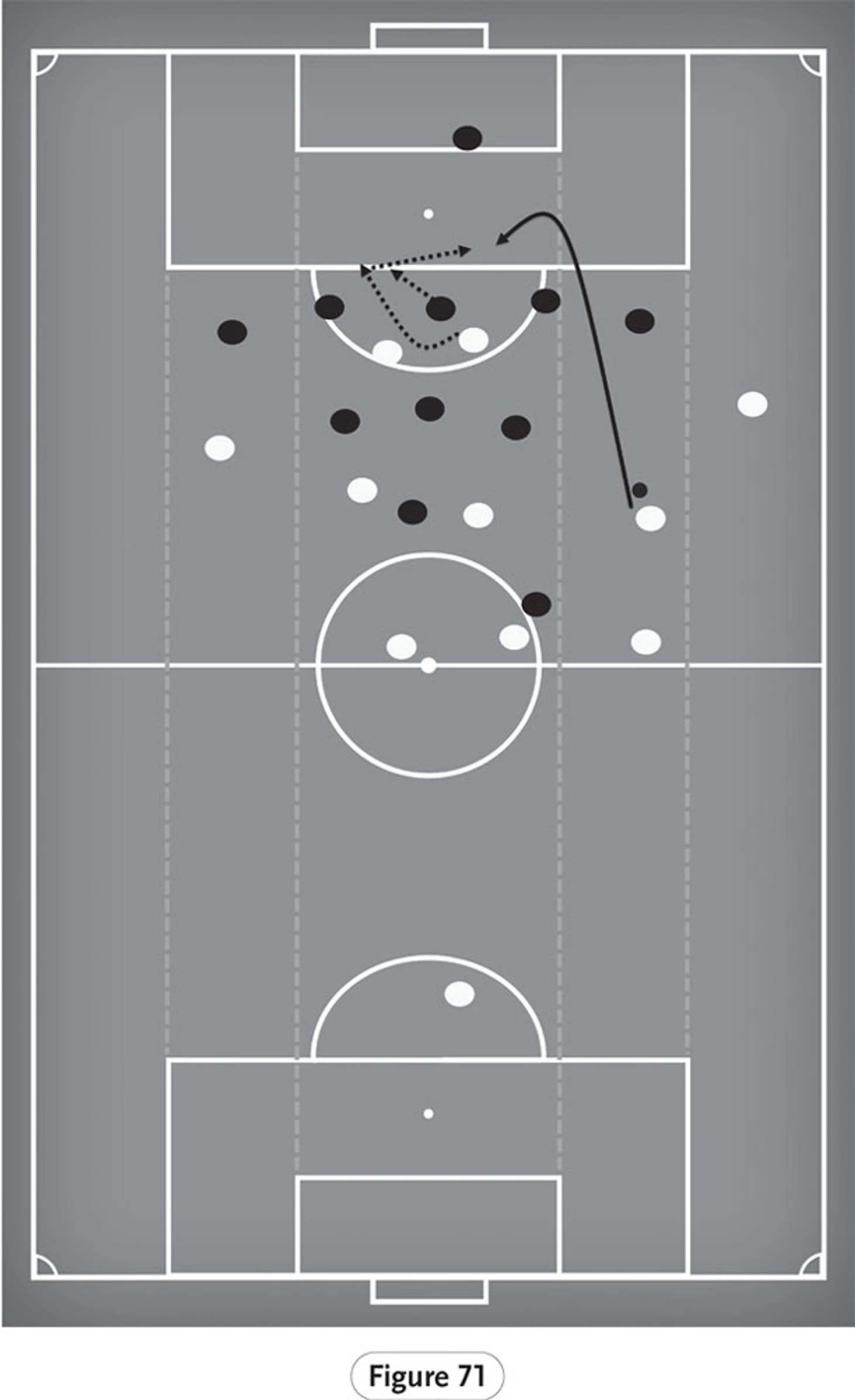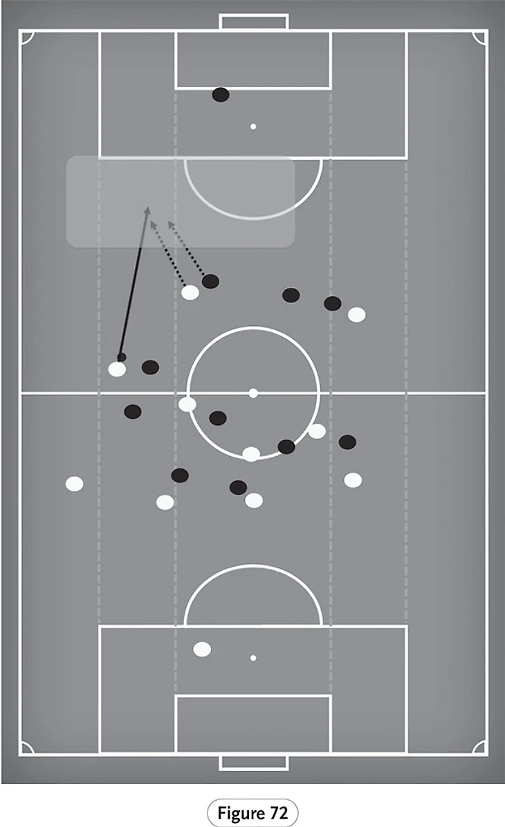 На рисунке 71 мы снова видим Салаха, расположившегося в центре, а не на правой стороне, против команды соперника, играющего в защите из пяти человек. Этот пример показывает интеллект и технические способности Салаха находить пространство в труднодоступных местах.