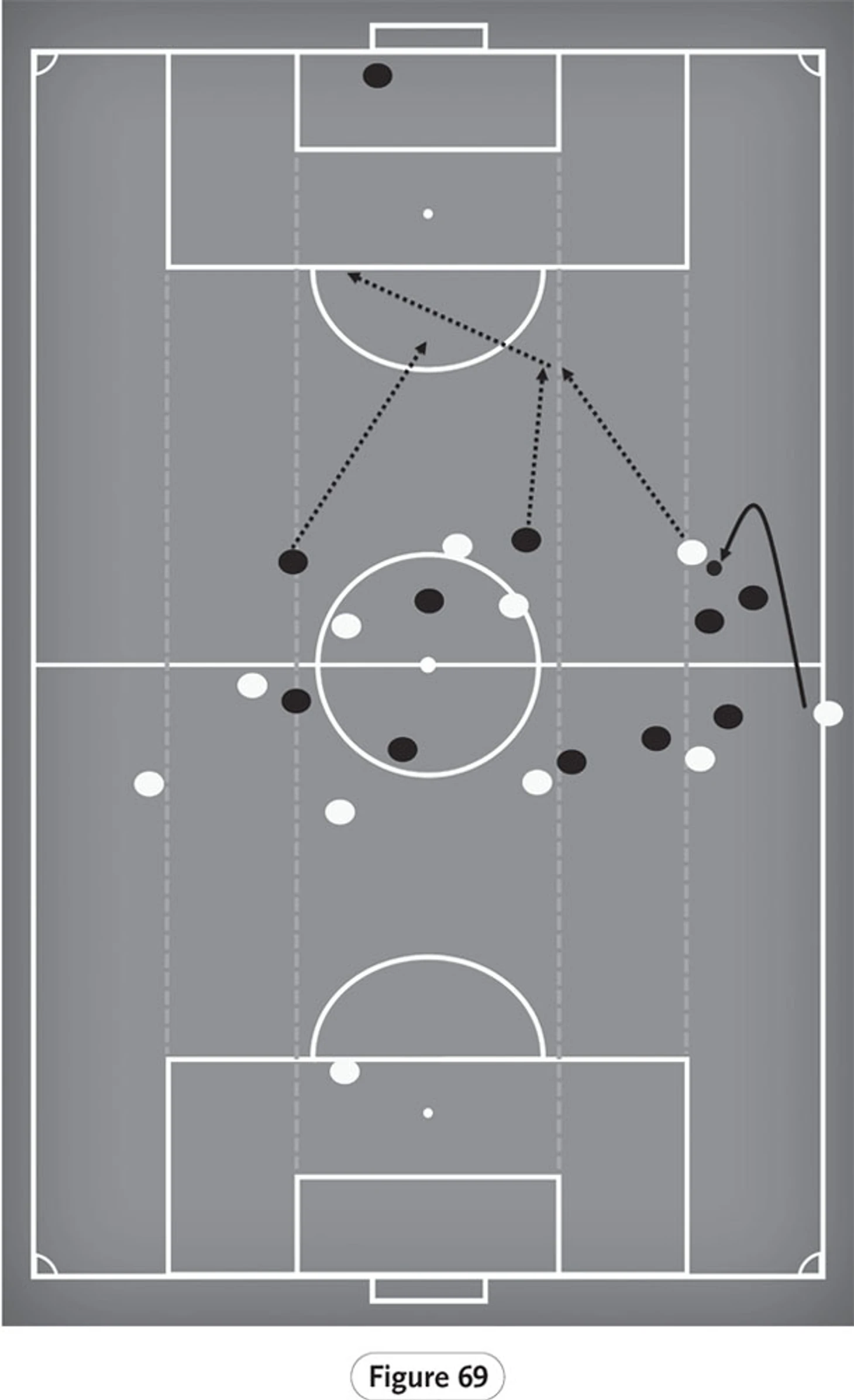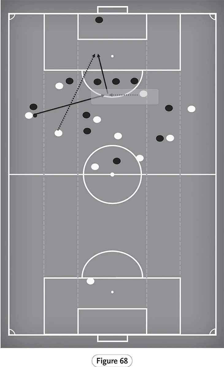 На рисунке 69 показан пример этого, когда «Ливерпуль» получил вбрасывание в широкой зоне. Бросок производится быстро, и два защитника соперника попадают в ловушку, пытаясь выиграть мяч; в итоге они оба промахиваются головой, и мяч падает к Салаху, который находится на свободном пространстве и ищет возможность завладеть мячом.