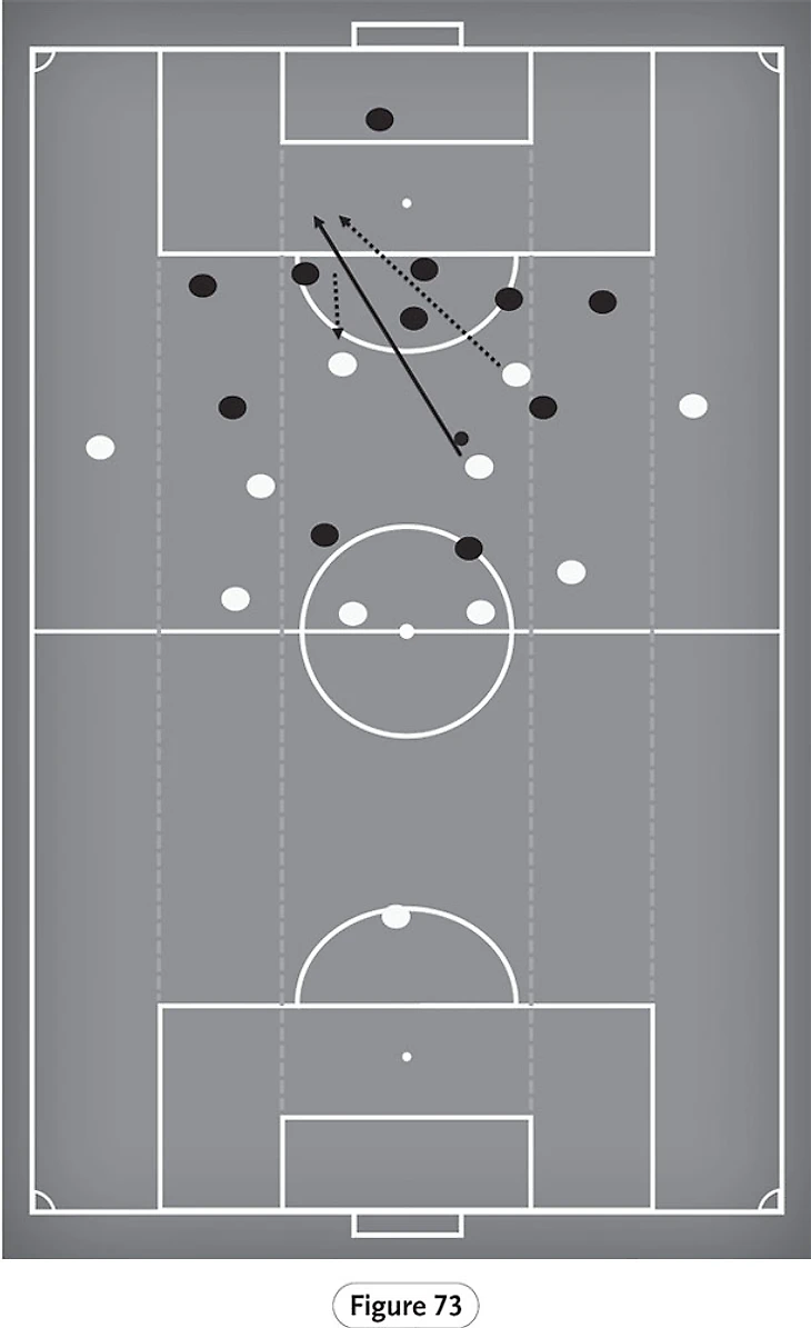 На рисунке 72 мы видим наглядный пример этого, в то время как «Ливерпуль» стремится двигаться вперед за счет быстрого перехода. Мяч перемещается на левую сторону, где Садьо Мане нашел вертикальную линию, по которой он может двигаться вперед. Как только мяч пересекает среднюю линию поля, Салах начинает совершать вертикальное движение, стремясь растянуть линию обороны и получить доступ к пространству за обороной соперника. Учитывая, что эта ситуация сложилась после исполнения стандартного положения соперником, в настоящее время они пытаются восстановить свою оборонительную позицию, но «Ливерпуль» атакует столь быстро, что защитник все еще изолирован. Это, опять же, пример вертикальности, в которую любит играть «Ливерпуль». Когда Мане овладевает мячом, то играет пас под углом вперед на ход Салаху, и египетский форвард может оторваться от защитника и совершить движение в штрафную площадь, чтобы получить шанс забить.