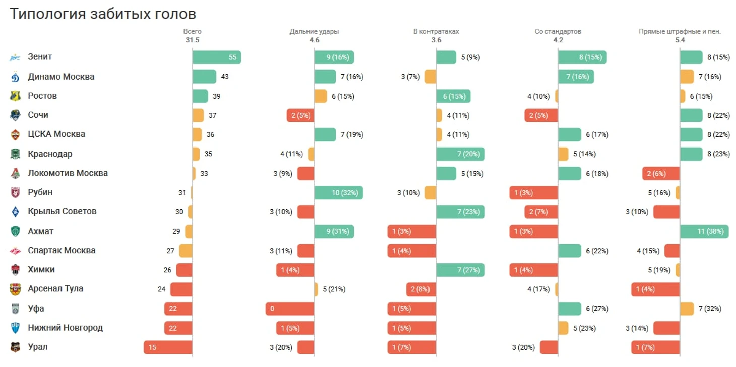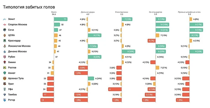Оказалось, что нет. В этом сезоне «Рубин» по-прежнему лидирует по голам после дальних ударов – 10. И более того, процент таких голов от общего количества вырос с 22% до шокирующих 32% при среднем показателе в 15% по этому сезону РПЛ. То есть практически треть забитых мячей «Рубина» приходит с дальней дистанции.