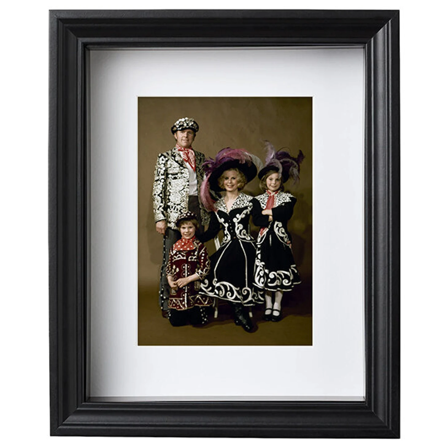 Точнее фотографию можно было бы назвать совсем обычной – банальный парадный семейный портрет с женой и детьми. Но обращает внимание одежда, в которую облачились Муры для фотосессии. На сэре Роберте – какая-то странная кепка, унизанная непонятными круглыми штуками. Напоминает атрибутику какого-то собирателя значков. Такие же круглые предметы обильно нашиты и на куртку, расписанную вычурными узорами. На жене и дочке – черные платья с крупным белым орнаментом. На сыне Дине – как и на папе – кепка и пиджак все с теми же кругляшами.