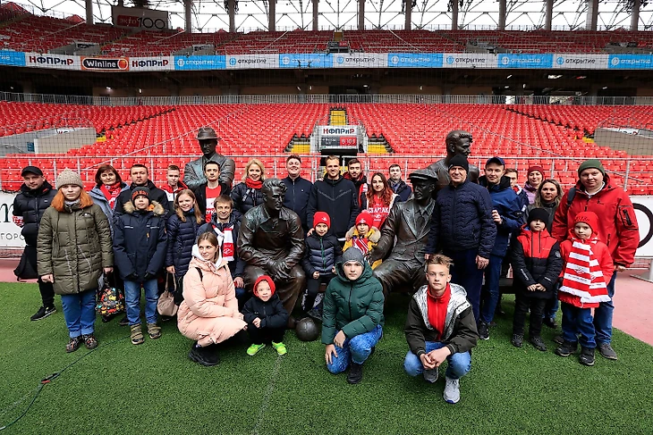 Вместе с Сашей и нашим экскурсоводом гости стадиона посетили домашнюю раздевалку команды, прошлись по кромке поля до памятника братьям Старостиным, побывали в зале для пресс-конференций, VIP-ложе и нашем интерактивном музее.