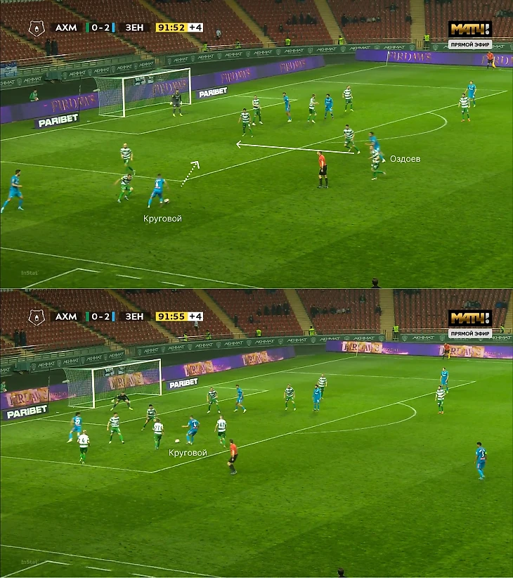 В таких эпизодах он нацелен на пас вперед или улучшение позиции для удара. Например, в игре против «Ахмата» Круговой увидел пространство в штрафной: сместился в середину и отыгрался с Оздоевым, но в последний момент его накрыли.