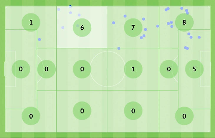 Ниже – карта успешных обводок Кругового. Он активно обыгрывал в финальной трети и штрафной, врываясь за спины или комбинируя с бразильцами. Еще Круговой часто открывался в широкой позиции: команда атаковала через середину или правый фланг, а он ориентировался на свободное пространство.