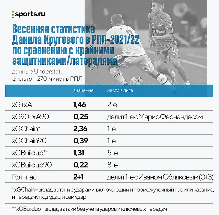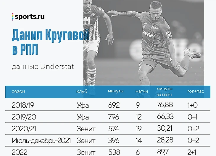 В 2022-м Данил Круговой наконец заиграл в основном составе «Зенита». За весенний отрезок он почти догнал свои минуты прошлого сезона и, вероятно, скоро превзойдет предыдущие.