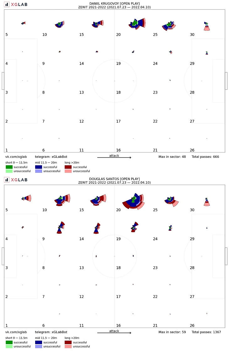 Ниже – сравнение вовлеченности Кругового и Сантоса. Данил гораздо чаще играл по флангу и лишь ситуативно смещался в центр, когда использовал диагональный дриблинг или освобождал пространство для партнера – а Сантос заходил в полуфланг и помогал около своих ворот. Основное различие – в целях: Данил врывался за спины, обыгрывал и навешивал, а Сантос еще влиял на игру из глубины, особенно после ухода Ярослава Ракицкого.
