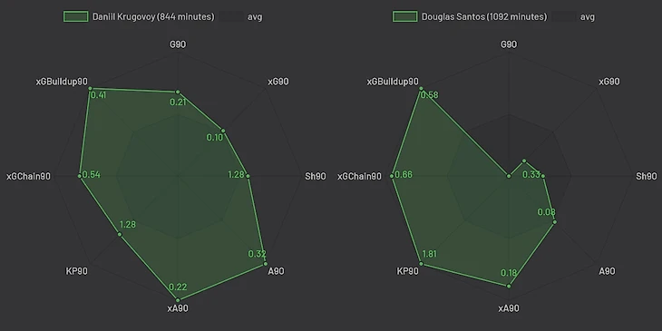 Вот подтверждение того, что Круговой нацелен на предголевые действия (xA90, A90, xG90, Sh90), а Дуглас больше участвовал в развитии атак на своей половине (xGChain90, xGBuildup – учитывались только матчи на позиции левого защитника/латераля): Данил чаще бил, отдавал голевые, но реже участвовал в контроле и удержании мяча.