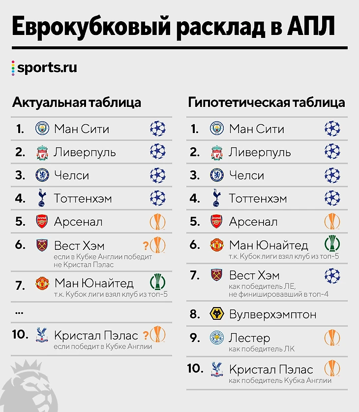 В правой части картинки клубы произвольно расставлены по местам с учетом условий, которые расширят английский состав в еврокубках. Например, для этого нужно, чтобы в Кубке Англии победил «Кристал Пэлас» (играет в полуфинале с «Челси», в другом «Ман «Сити» против «Ливерпуля»), в Лиге Европы – «Вест Хэм» (в полуфинале играет с «Айнтрахтом»), а в Лиге конференций – «Лестер» (в полуфинале играет с «Ромой»).