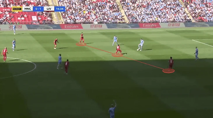 Затем «Сити» пытается сыграть через Фернандиньо, а передняя тройка «Ливерпуля» находится еще выше, чтобы предотвратить легкий пас вперед.