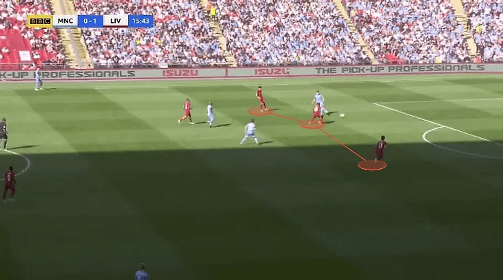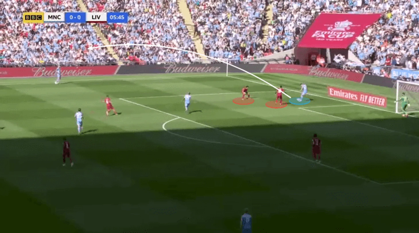 ...и когда он отдает пас назад на Натана Аке, три игрока «Ливерпуля» оказываются в состоянии надавить и загнать «Сити» в угол. Мане мешает Аке отдать мяч на Стеффена, поэтому тот отдает пас вперед на Бернарду Силву…