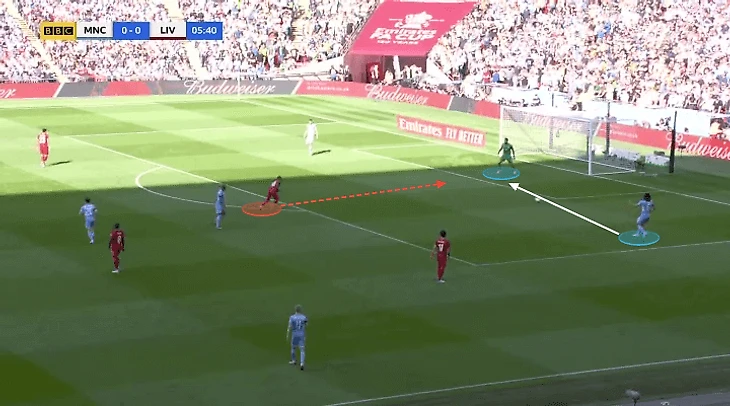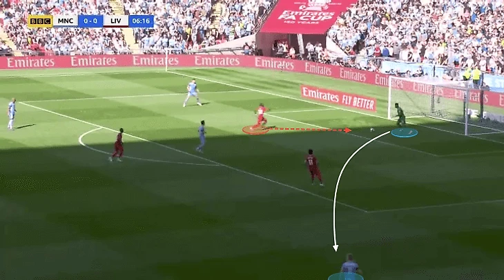 Теперь, когда Зинченко снова с мячом, у пять игроков «Ливерпуля» готовы поднажать и плотно прижаться к игроку «Сити» на этой стороне поля. Однако самое интересное движение — это движение Мане, который не прессингует во фланг, чтобы закрыть Аке, а вместо этого предвидит, что Зинченко, возможно, захочет вернуть мяч на своего вратаря и, соответственно, бросается на Стеффена…