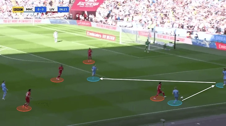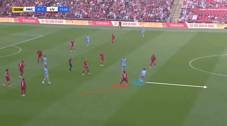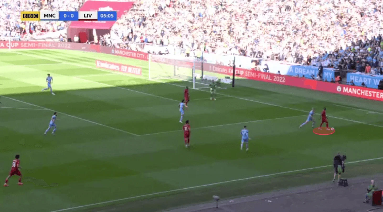 Затем «Ливерпуль» прессингует выше как единое целое. Диас, Мане и Салах мешают Стоунзу быстро сыграть вперед, так что «Сити» снова возвращает мяч Стеффену.