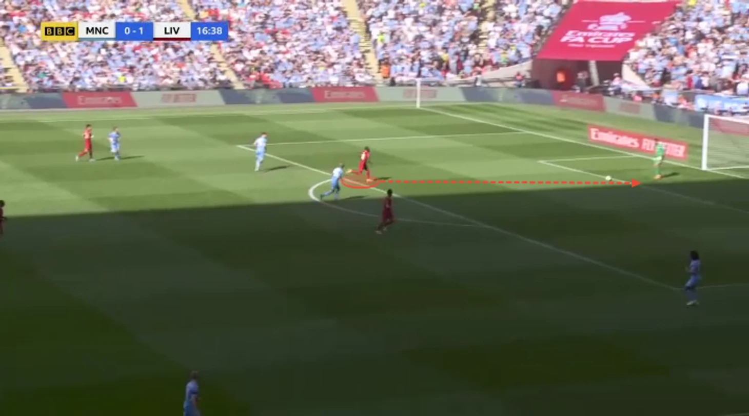Здесь, когда «Сити» строит атаку от вратаря, Мане начинает прессинг и вынуждает Стеффена принимать быстрое решение, отдав мяч вбок на Джона Стоунза.