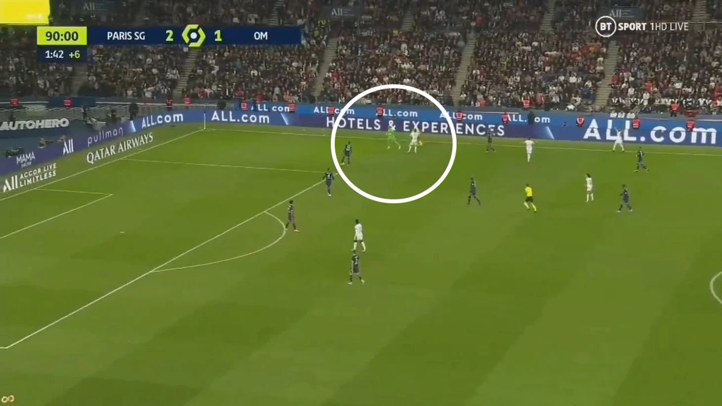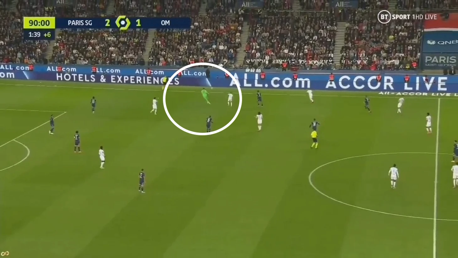 Но это не все. Вратарь «ПСЖ» зачем-то подхватил отскочивший от рекламного бортика мяч и повел его в сторону своих ворот.