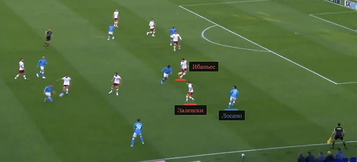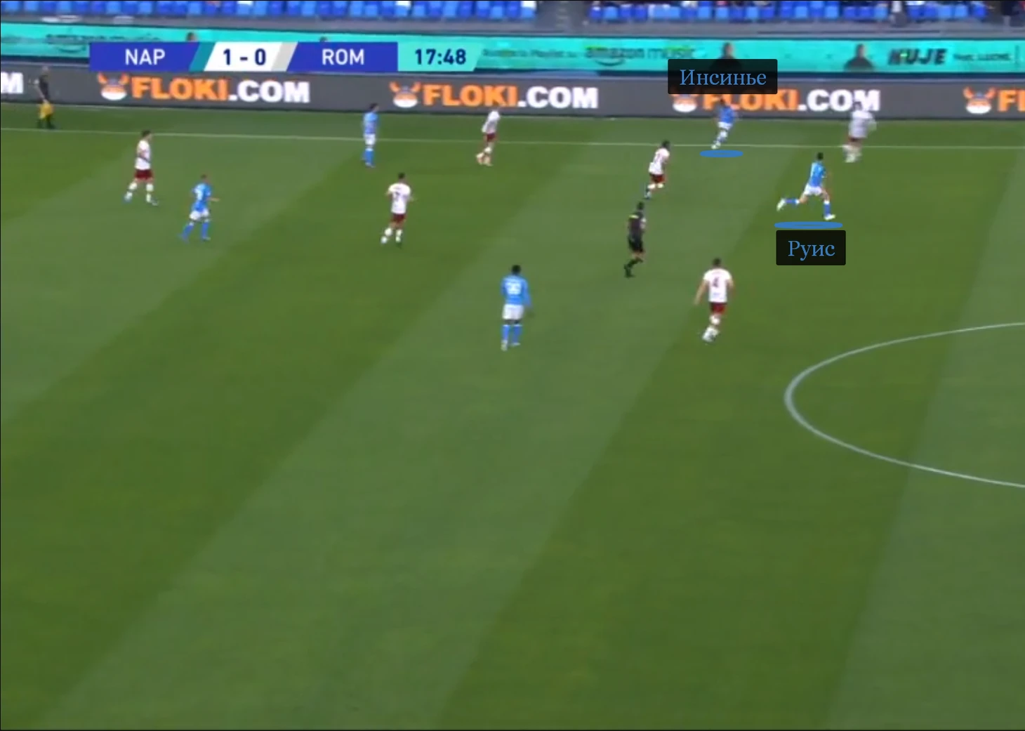 Иногда численное равенство восстанавливал Лоренцо Пеллегрини, который опускался в среднюю линию. На помощь неаполитанским хавбекам тут же прибегал Лоренцо Инсинье. Место итальянца на фланге заполнял Руис.