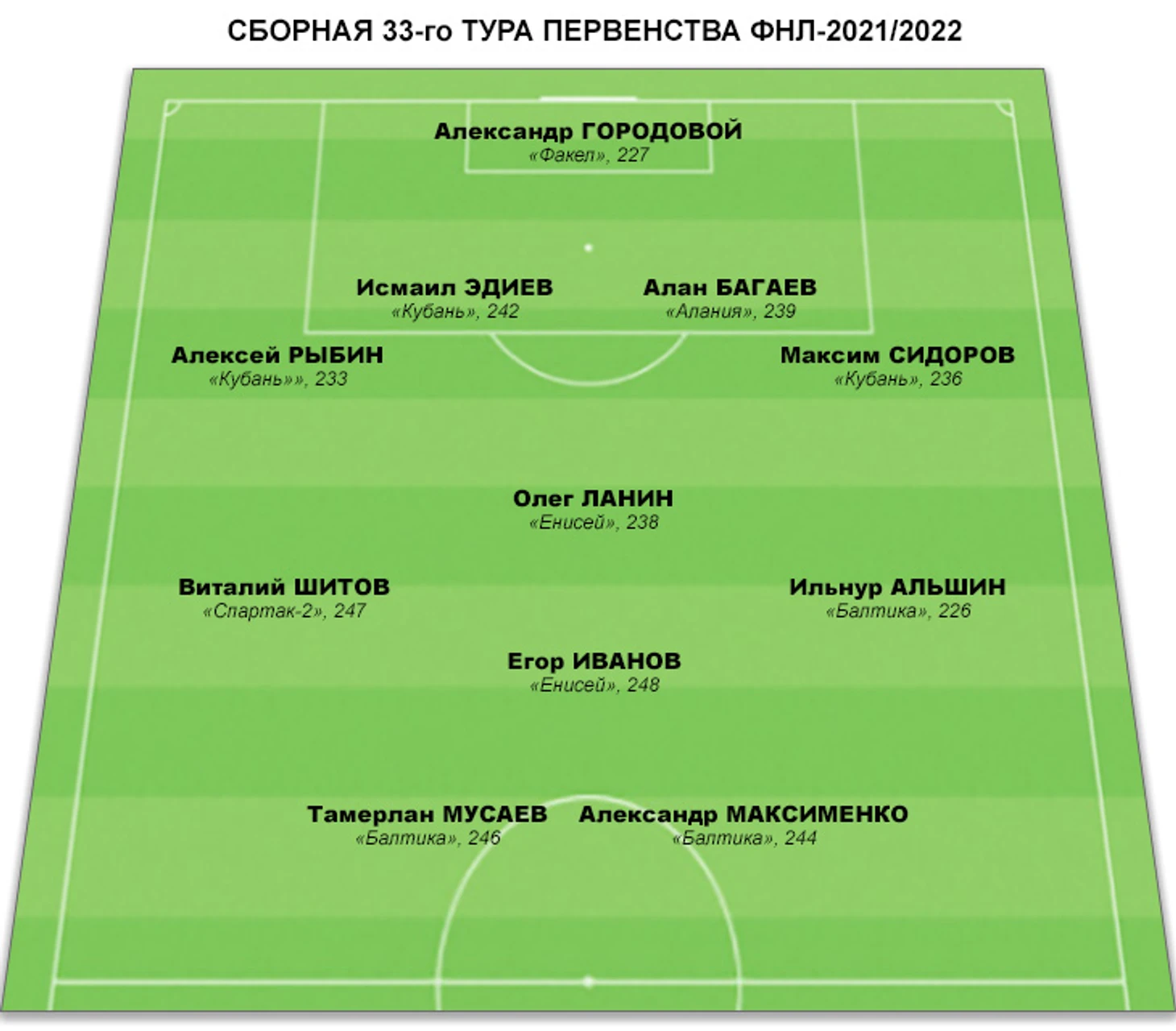 Сборная 33-го тура ФНЛ. По три игрока из «Балтики» и «Кубани», двое - из «Енисея»