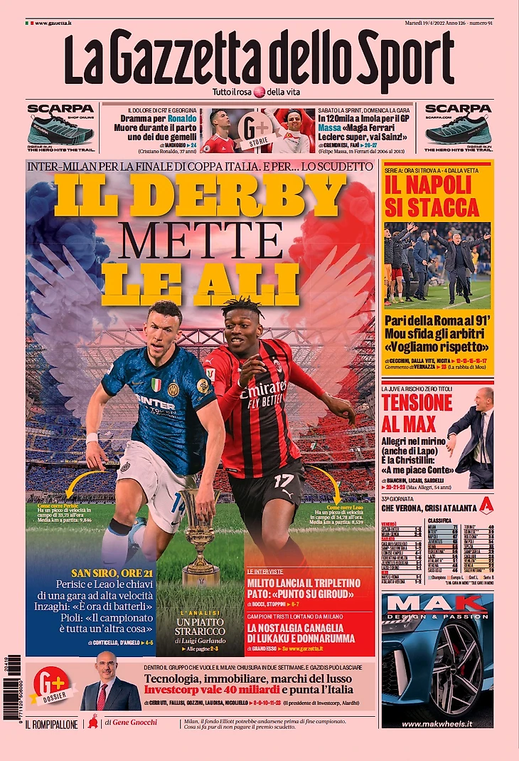 TuttoSport: «Тотальное Дерби, первый вердикт»: «Этим вечером «Интер»-«Милан» (21:00 СЕТ), в игре Кубок Италии после 0:0 в первом матче: это супер закуска полёта за Скудетто. Решающие часы также по продаже клуба Россонери фонду Инвесткорп».