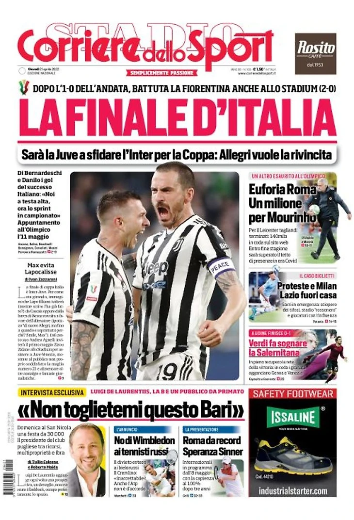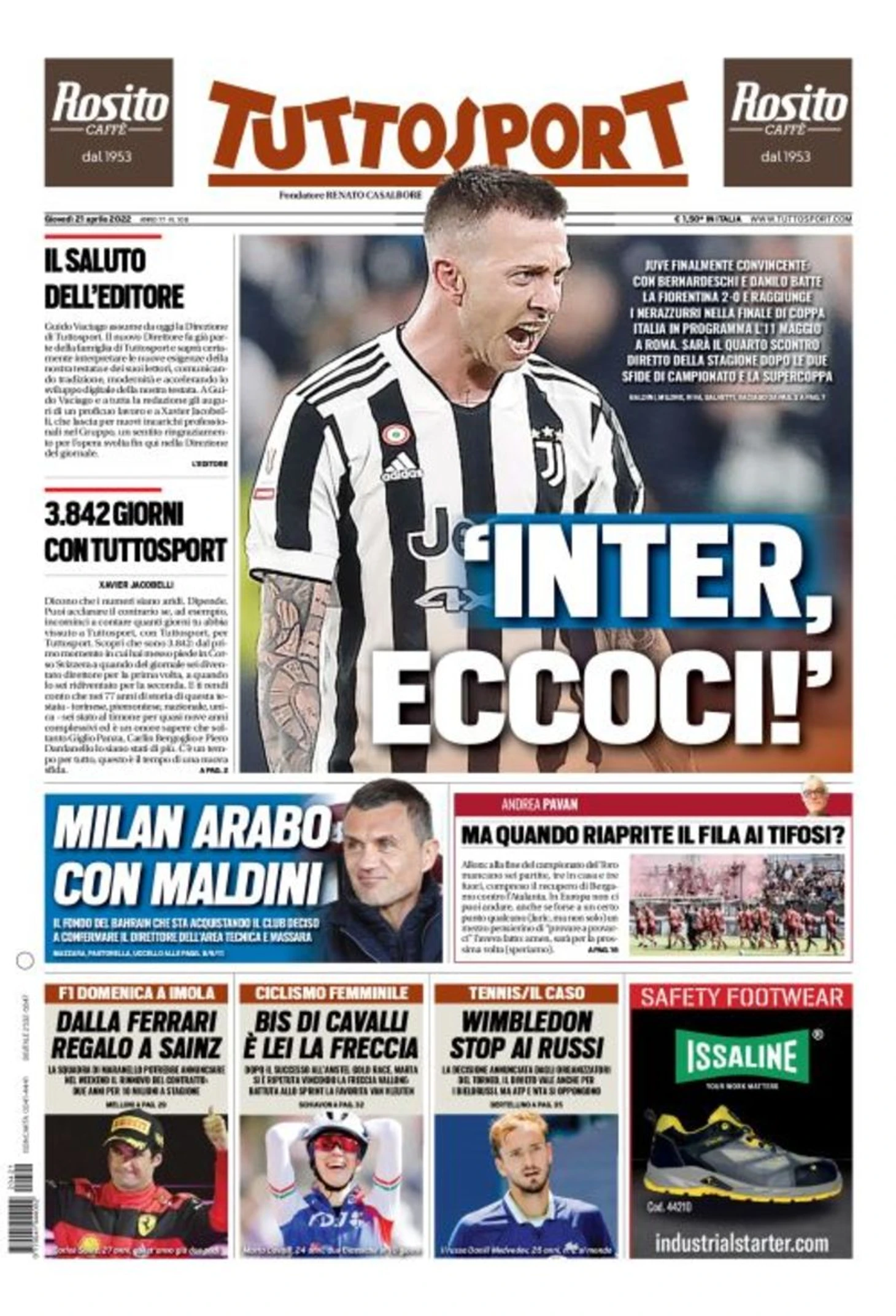 TuttoSport: «Интер», вот и мы!»: «Юве» наконец-то убедителен: благодаря Бернардески и Данило побеждена «Фиорентина» 2:0 и вышли к Нерадзурри в финал Кубка Италии, который состоится 11 мая в Риме. Это будет четвёртая личная встреча за сезон после двух матчей в чемпионате и в Суперкубке».